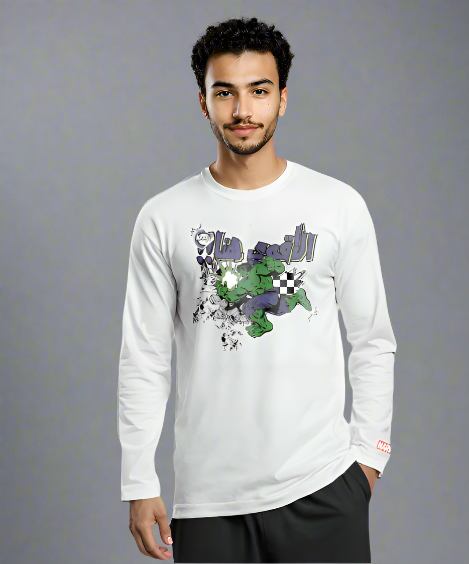 يتميز هذا القميص الأبيض ذو الأكمام الطويلة للرجال بشخصية Hulk الشهيرة، وهو مصنوع من قماش قطني بنسبة 100%.