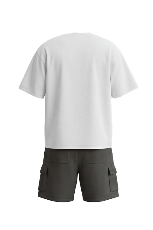 الطقم مكون من تيشيرت نص كم بقصة Oversize (واسعة) يمنح حرية حركة أكبر وإحساس بالراحة طوال اليوم، مع شورت بخصر مطاطي يوفر مرونة وثبات أثناء الحركة.