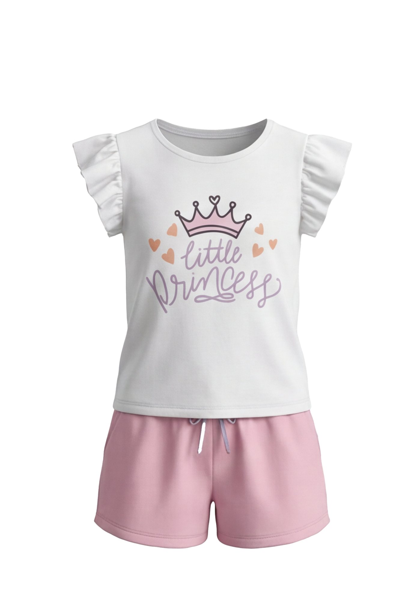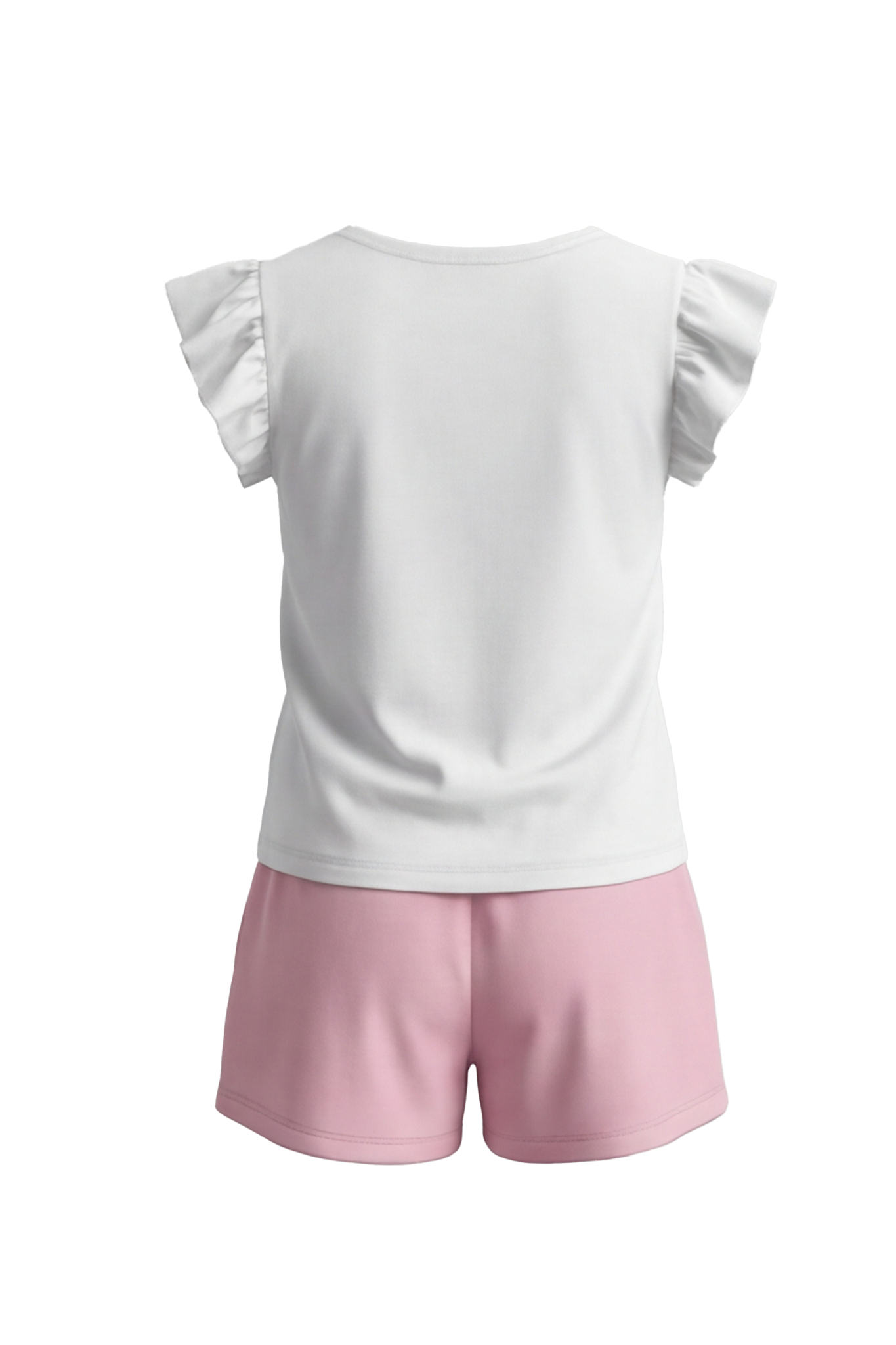 بيجامة بناتي تيشيرت كاب سليف بكشكشة مع شورت Bright White – بساطة ناعمة بإحساس أنثوي