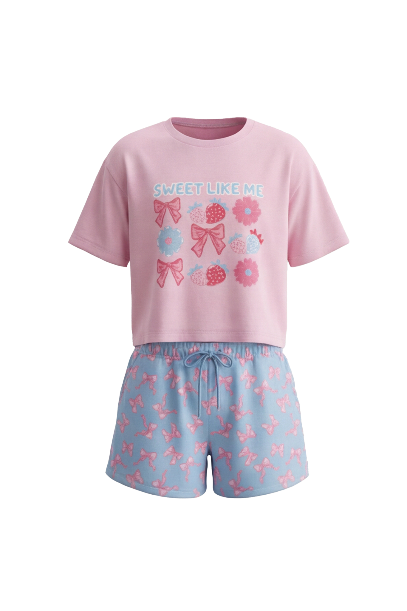 بيجامة بناتي باللون Ballerina مكونة من تيشيرت نص كم كروب أوفر سايز مع شورت واسع، مصنوعة من قطن 100% لتمنح راحة عصرية وإطلالة ناعمة.