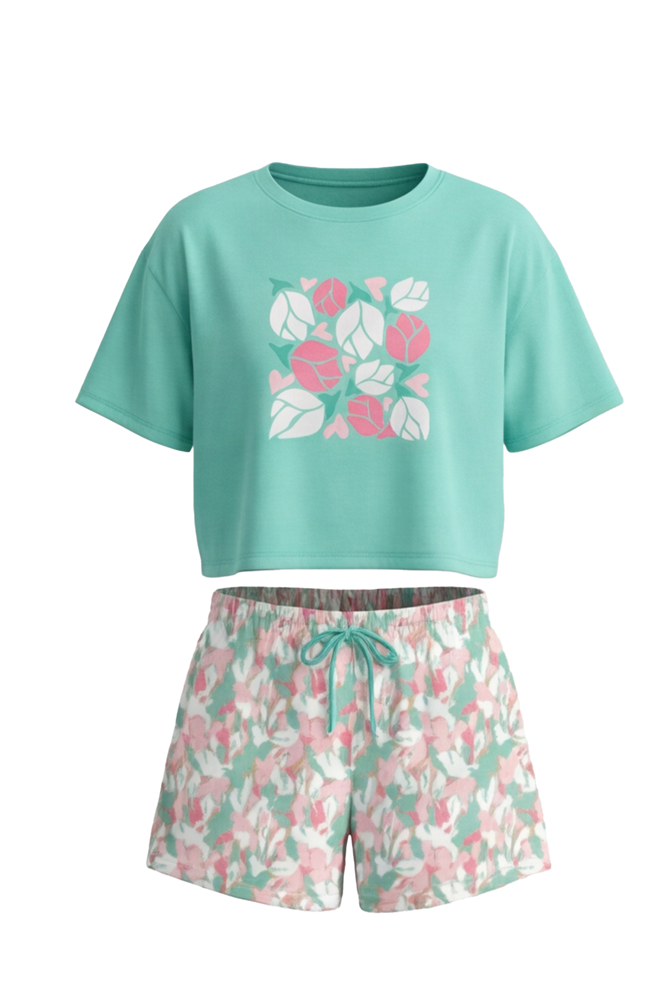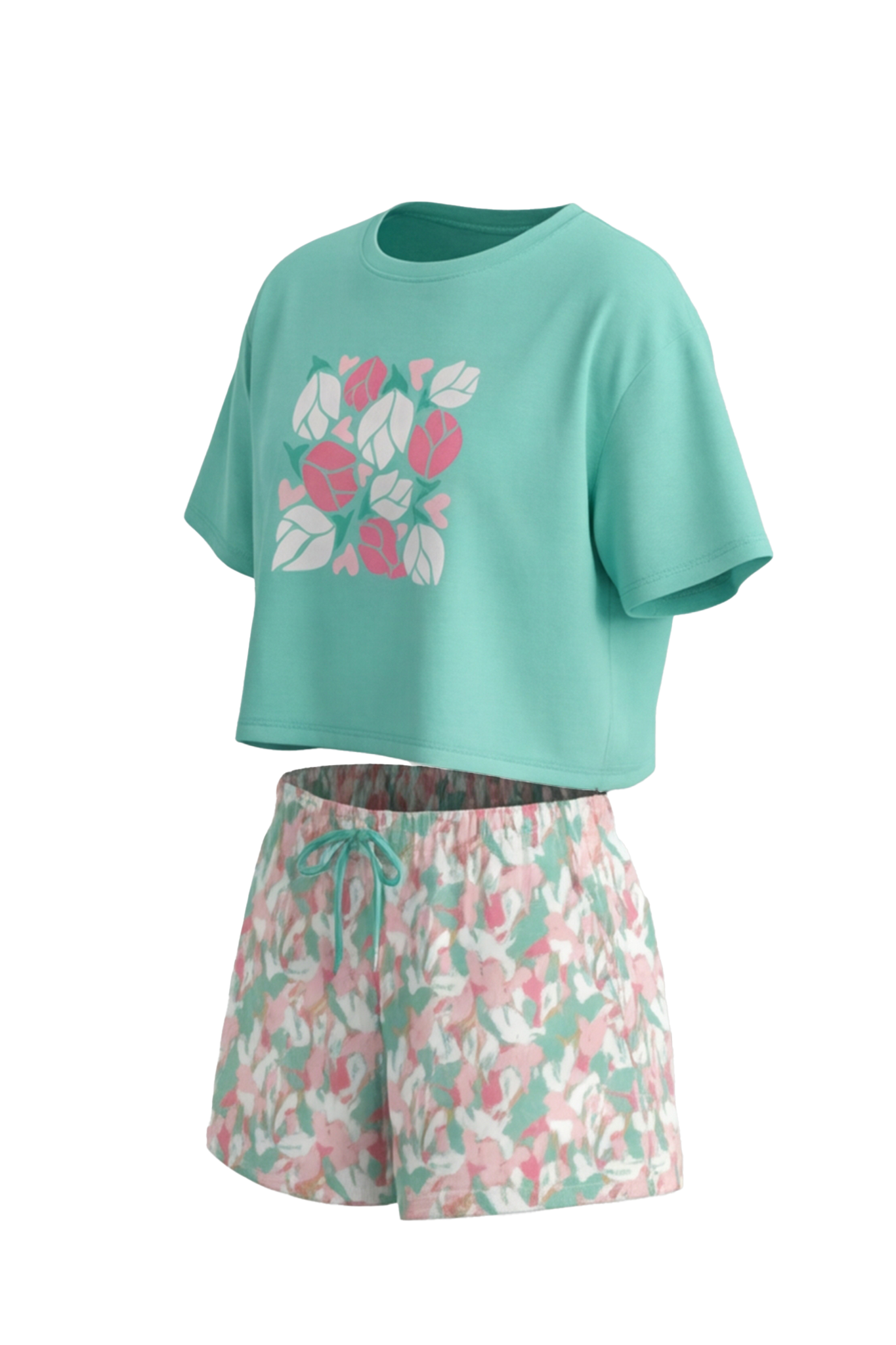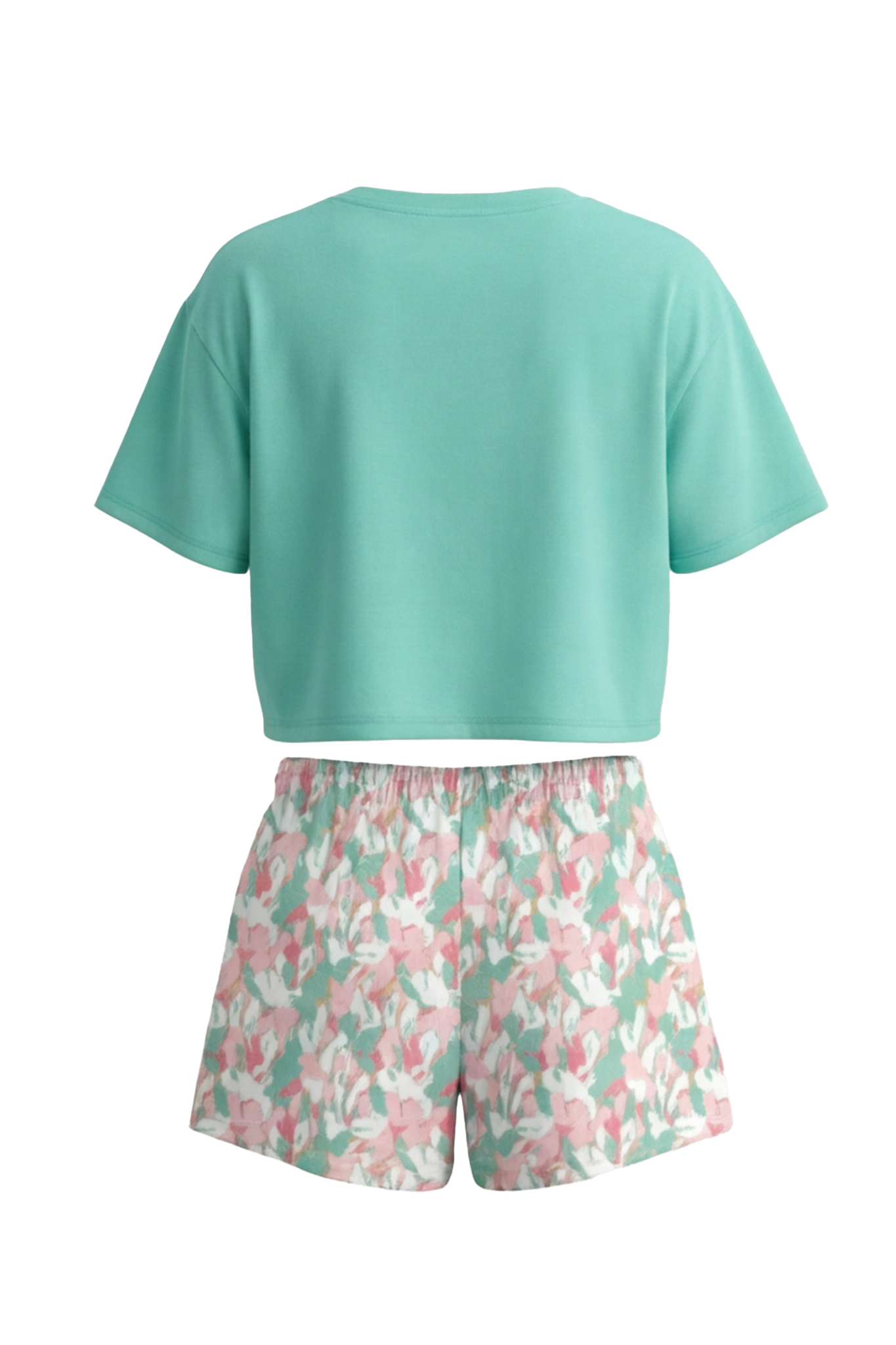 بيجامة بناتي باللون Cabbage مكونة من تيشيرت نص كم كروب أوفر سايز مع شورت واسع، مصنوعة من قطن 100% لتمنح راحة عصرية وإطلالة منعشة.
