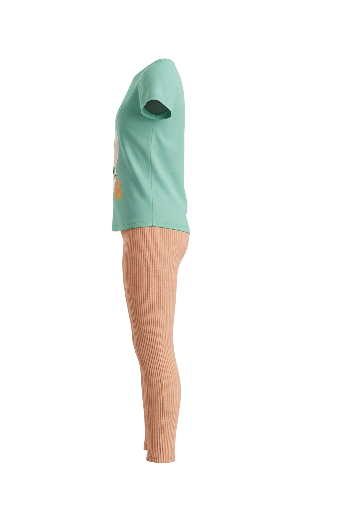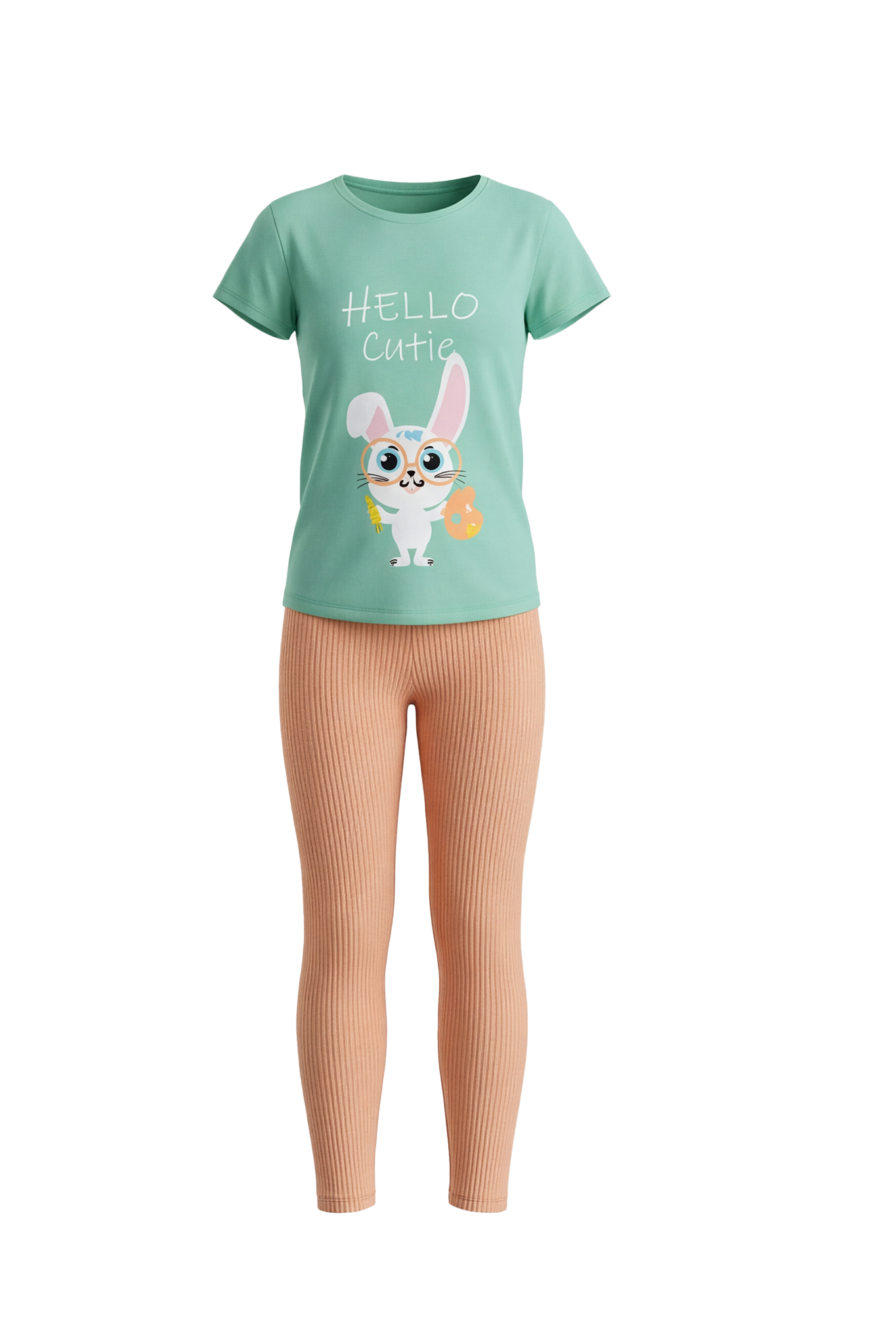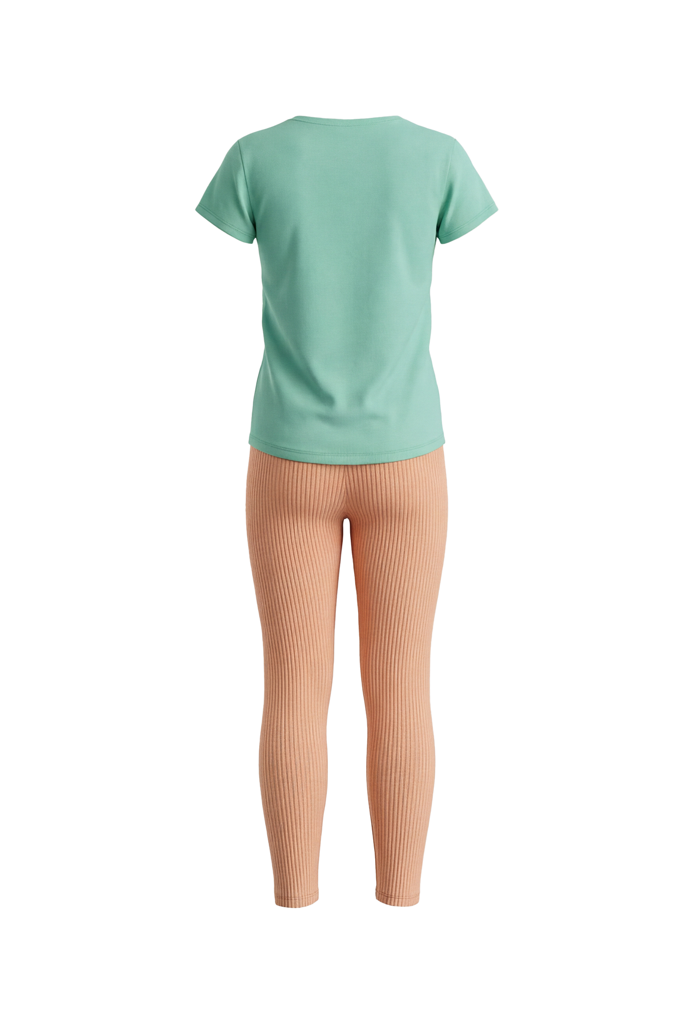 بيجامة بناتي باللون Cabbage مكونة من تيشيرت نص كم مع ليجن مضلع، مصنوعة من قطن 100% لتمنح راحة ناعمة وإطلالة منعشة وعصرية.