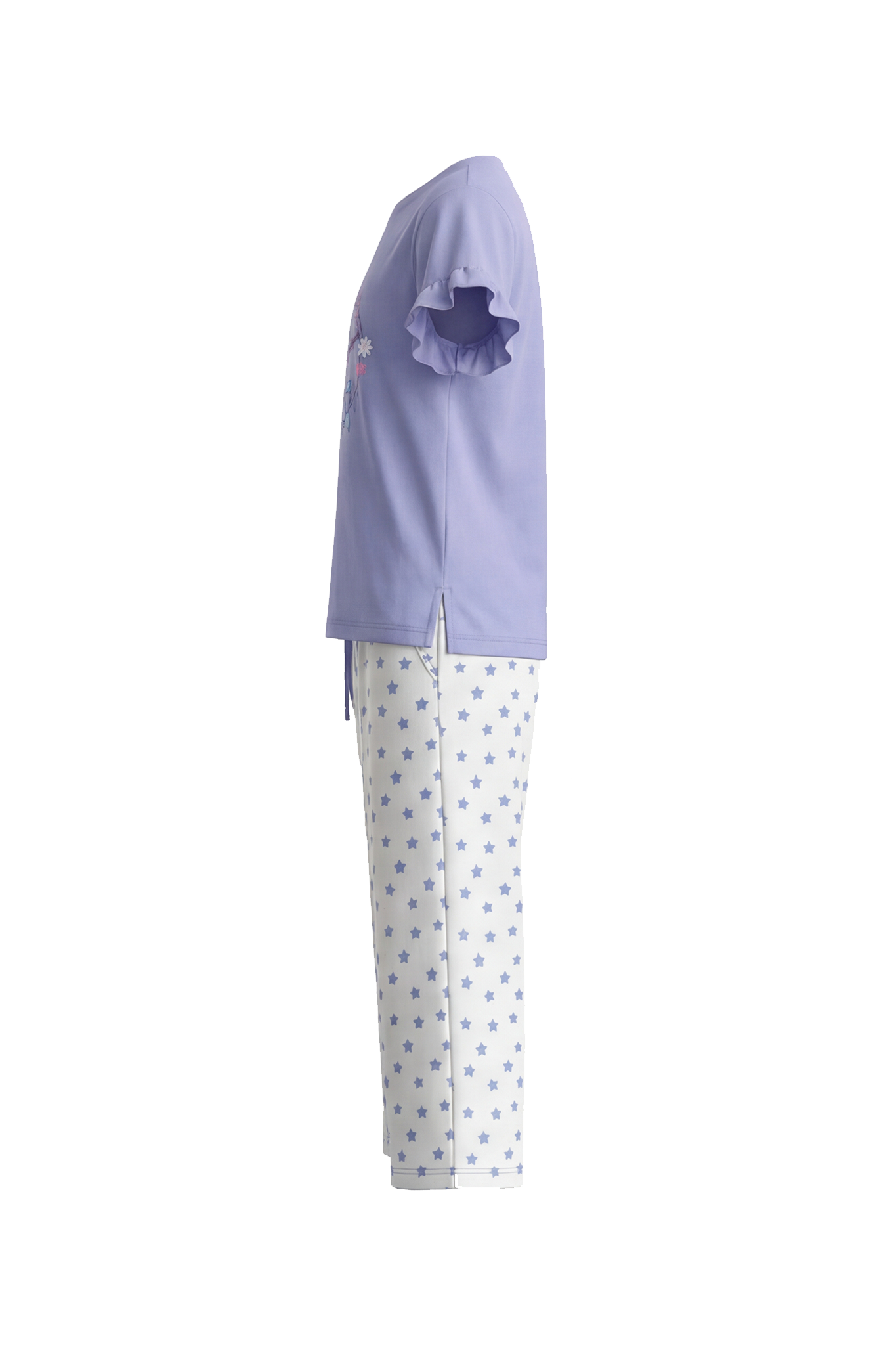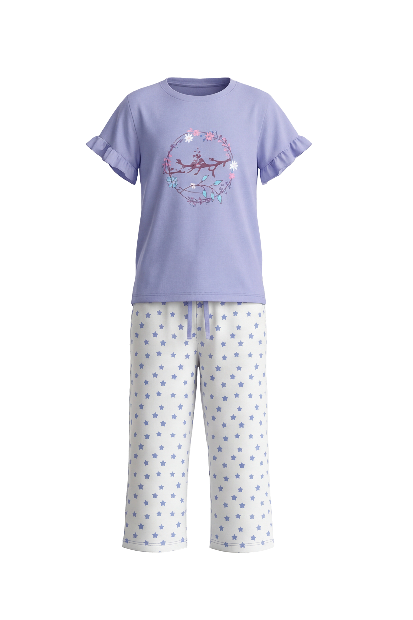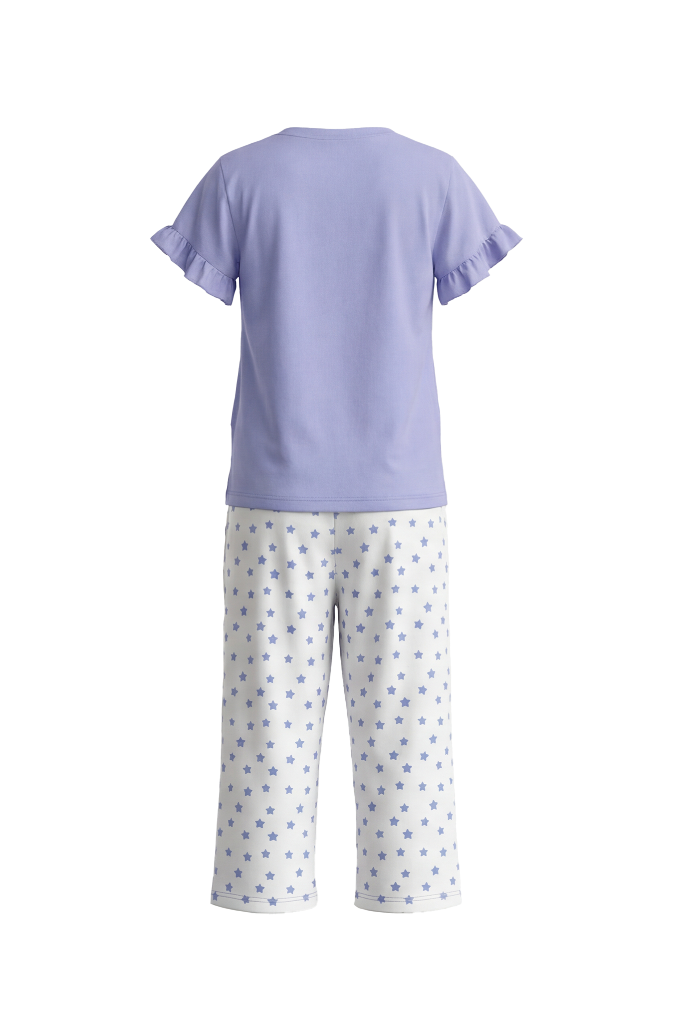 بيجامة بناتي باللون Baby Lavender مكونة من تيشيرت نص كم بكشكشة مع بنطلون برمودا، مصنوعة من قطن 100% لتمنح راحة ناعمة وإطلالة رقيقة ومريحة.