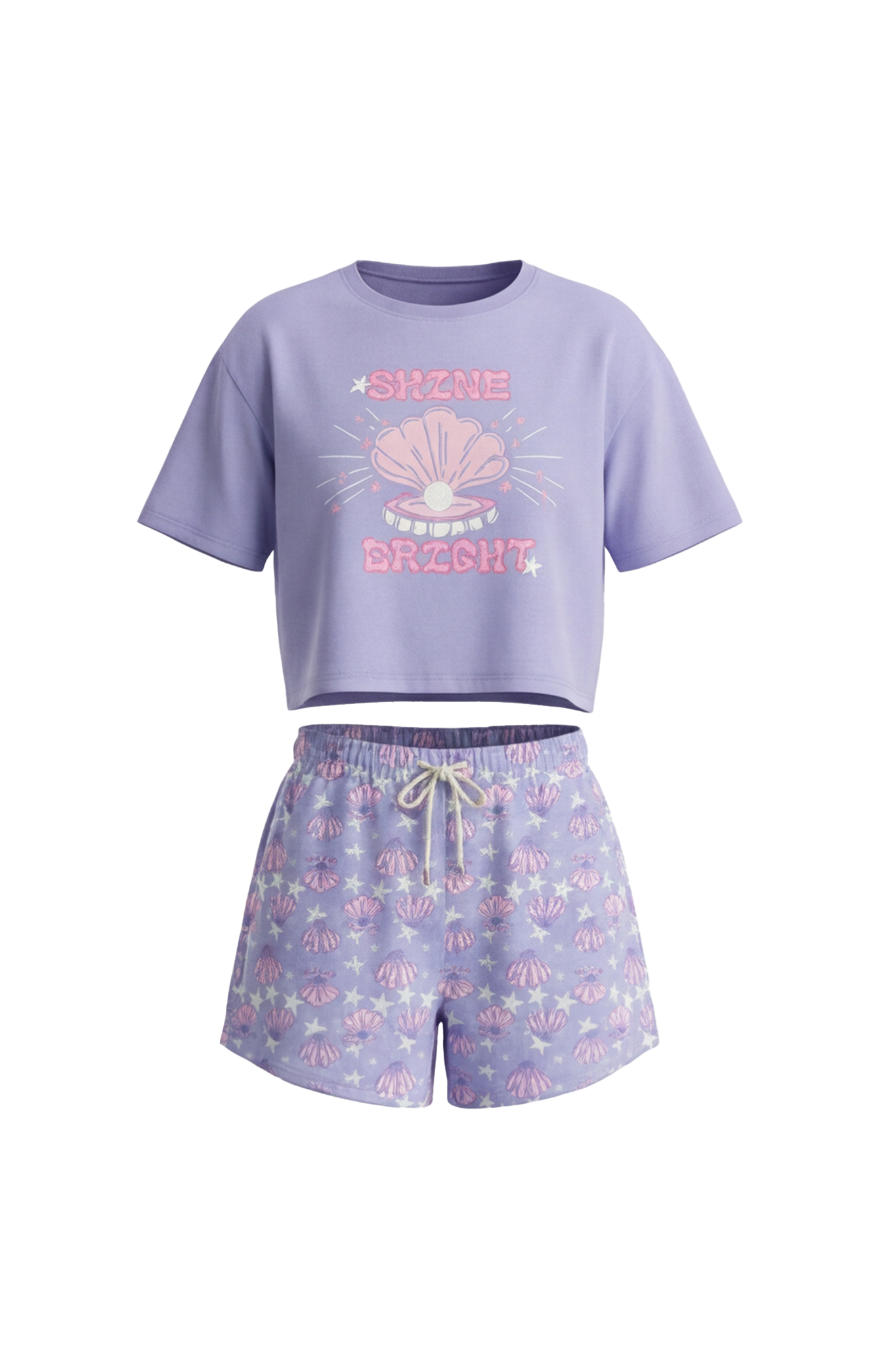 The trendy cropped silhouette combined with wide-leg shorts provides freedom of movement and a fashionable look, while the Baby Lavender shade adds a soft and delicate touch to girls’ sleepwear collections.