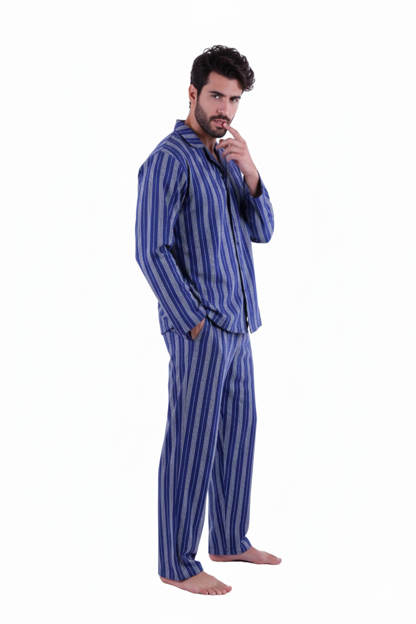 Men’s Long Sleeve Pajama with Buttons – Navy Green Stripe